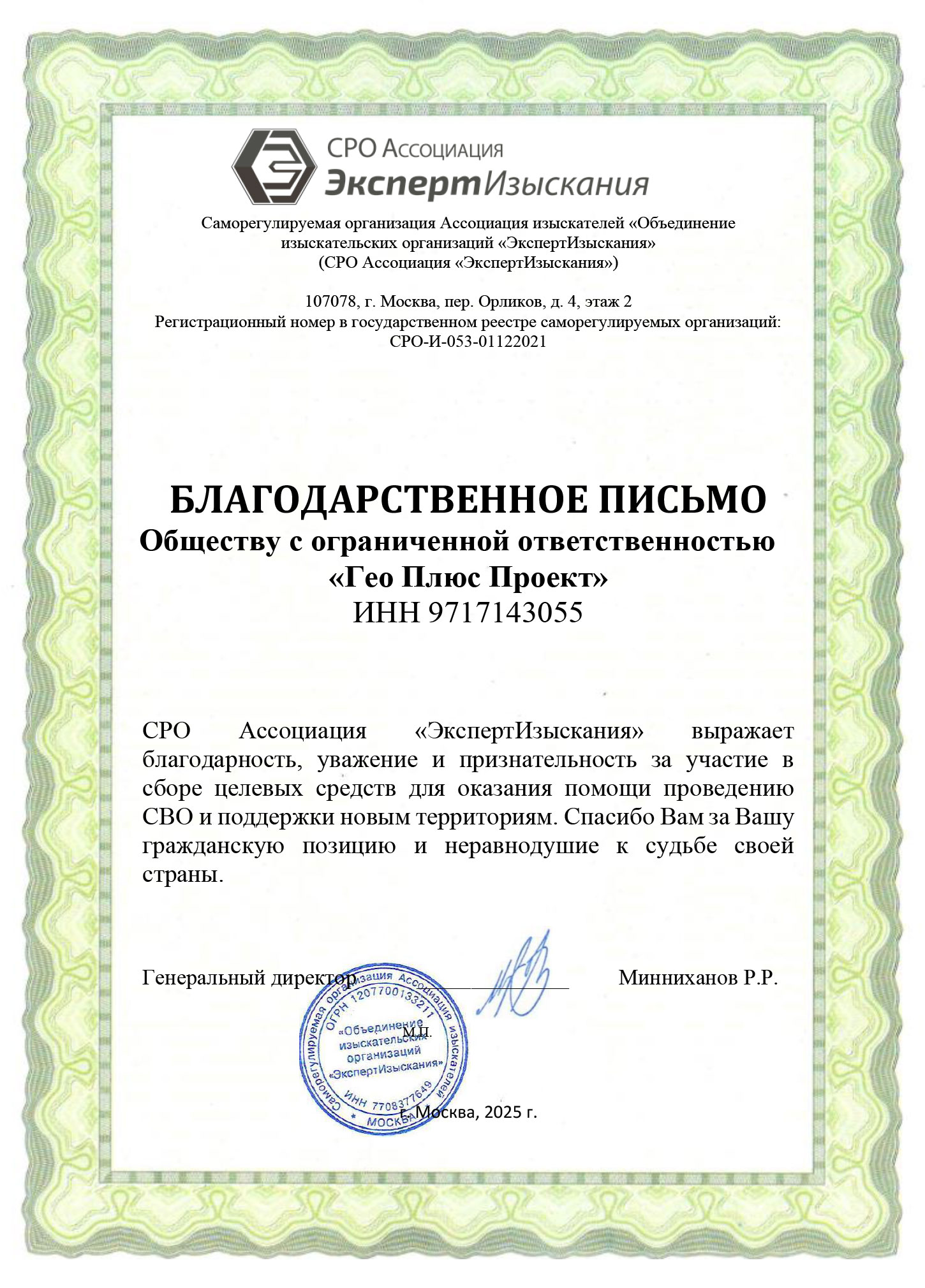 Благодарность за оперативную финансовую поддержку в виде добровольных пожертвований на счет Фонда Храма Христа Спасителя для создания благоукрашательных работ по воссозданию и художественному убранству Храма - национальной и государственной святыни России.